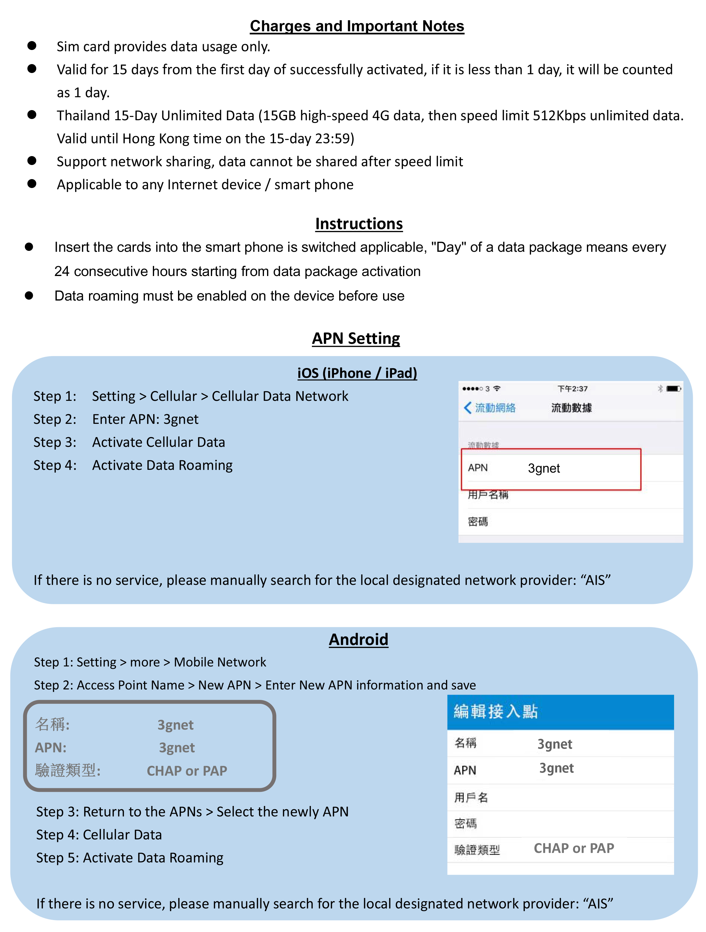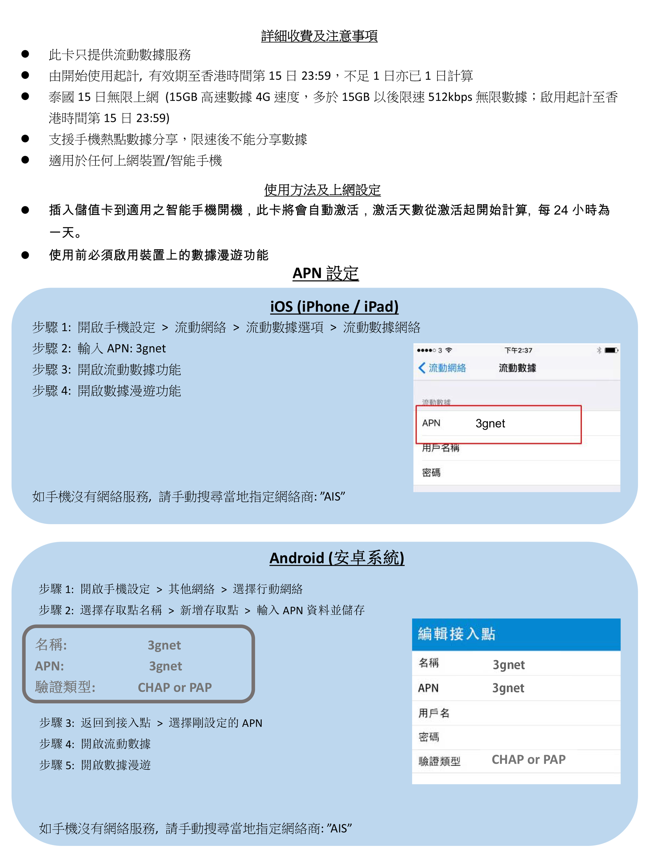 -泰國15日15GB上網 -由成功開卡當天起計15日有效 -首15GB為4G速度,其後將降速至512kbps無限數據 -支援手機熱點數據分享,限速後不能分享數據 -無須登記,即買即用 -三合一SIM卡, 適用於任何上網裝置 / 智能手機 -最後啟用日期: 2026/12/31 - 【泰國網絡: AIS】 -Thailand 15-Days 15GB Data -Valid for 15 days from the day of activation -The first 15GB is at 4G speed, after which it will be throttled to 512kbps unlimited data -Available to tethering share data, cannot be shared data after the speed limit. -Registration not required -3-in-1 SIM card, suitable for any internet device / smartphone -Expiry date: 2026/12/31 -【Thailand Networks: AIS】