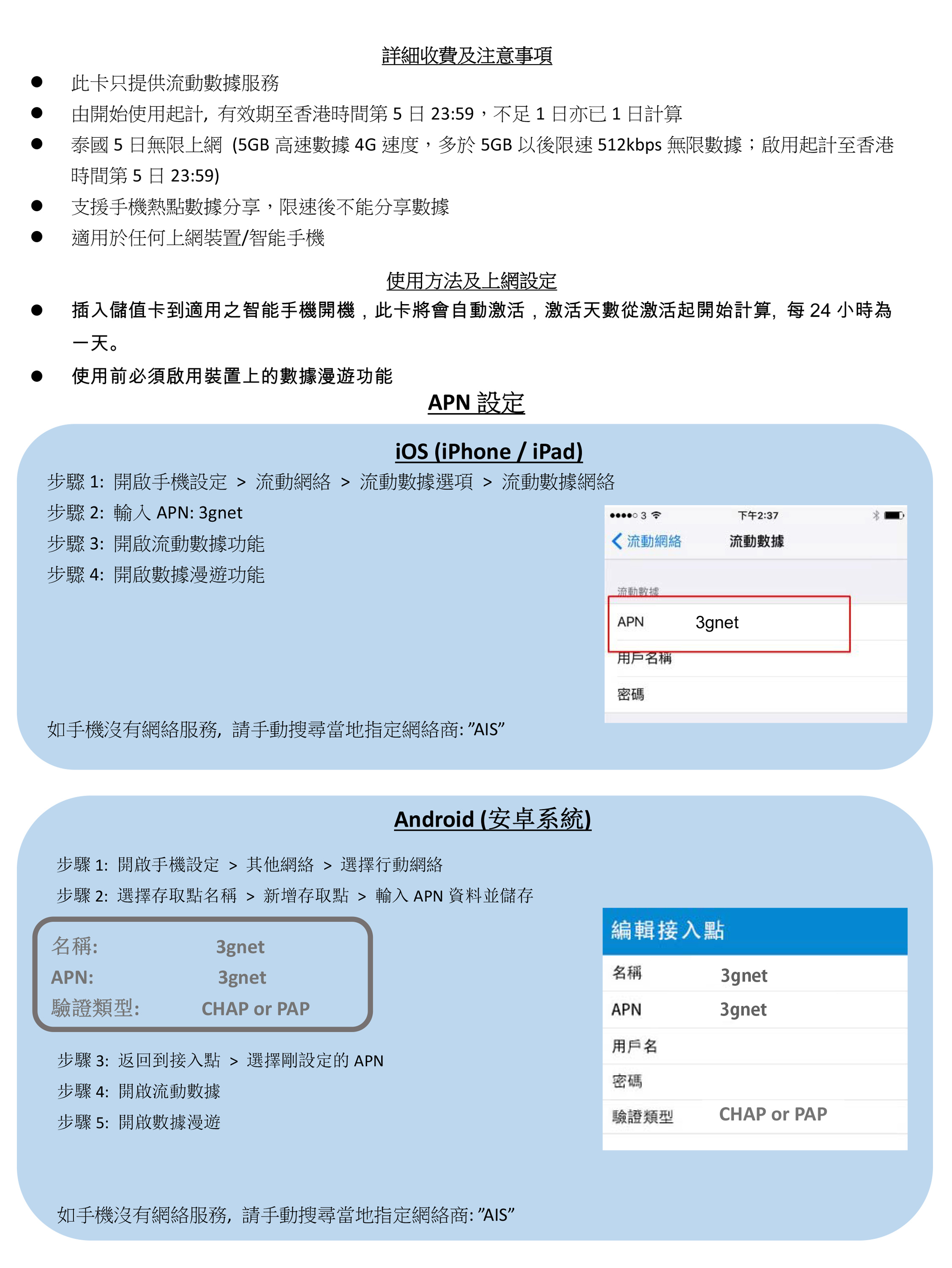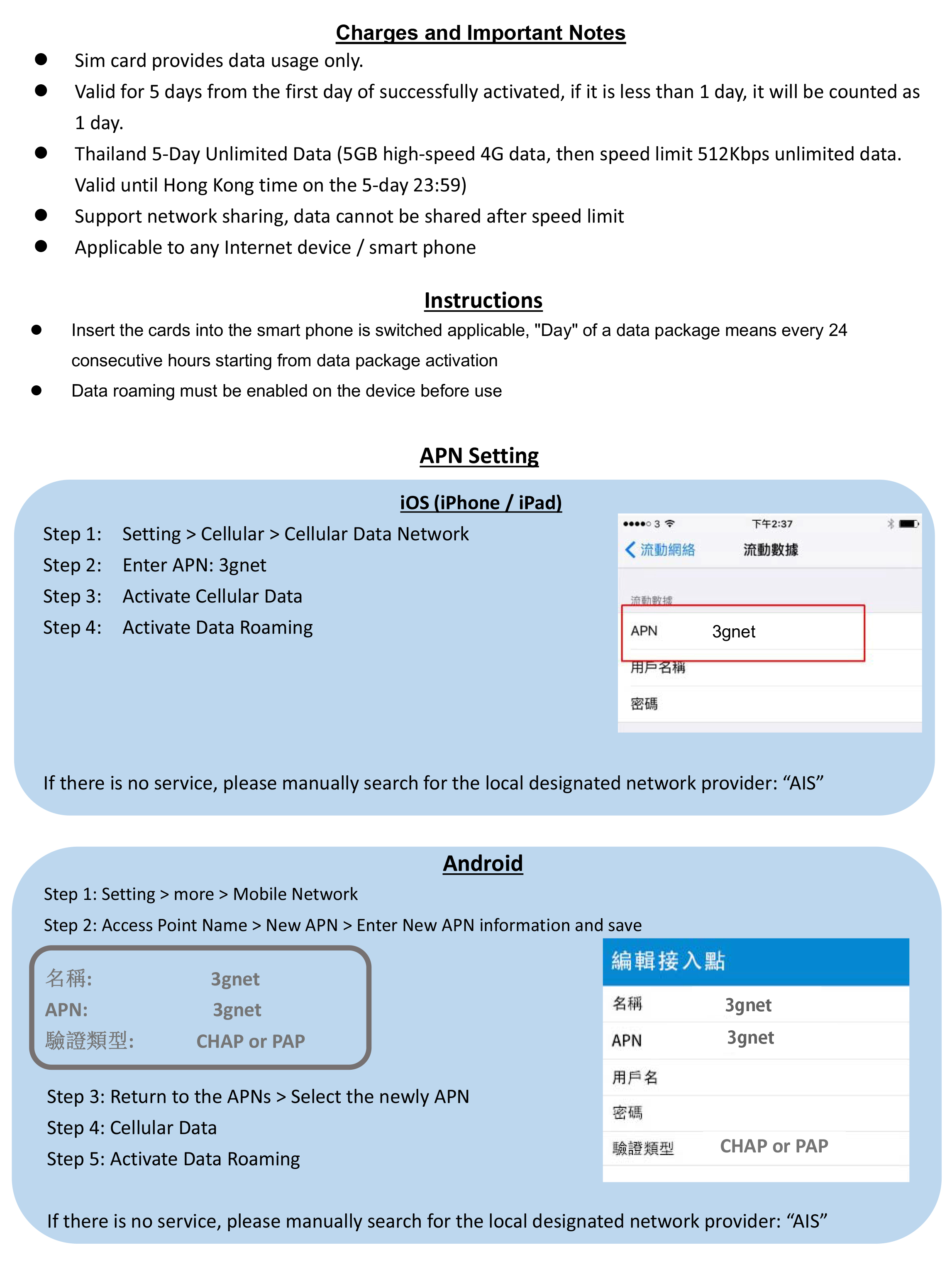 -泰國5日5GB上網 -由成功開卡當天起計5日有效 -首5GB為4G速度,其後將降速至512kbps無限數據 -支援手機熱點數據分享,限速後不能分享數據 -無須登記,即買即用 -三合一SIM卡, 適用於任何上網裝置 / 智能手機 -最後啟用日期: 2026/12/31 - 【泰國網絡: AIS】 -Thailand 5-Days 5GB Data -Valid for 5 days from the day of activation -The first 5GB is at 4G speed, after which it will be throttled to 512kbps unlimited data -Available to tethering share data, cannot be shared data after the speed limit. -Registration not required -3-in-1 SIM card, suitable for any internet device / smartphone -Expiry date: 2026/12/31 -【Thailand Networks: AIS】