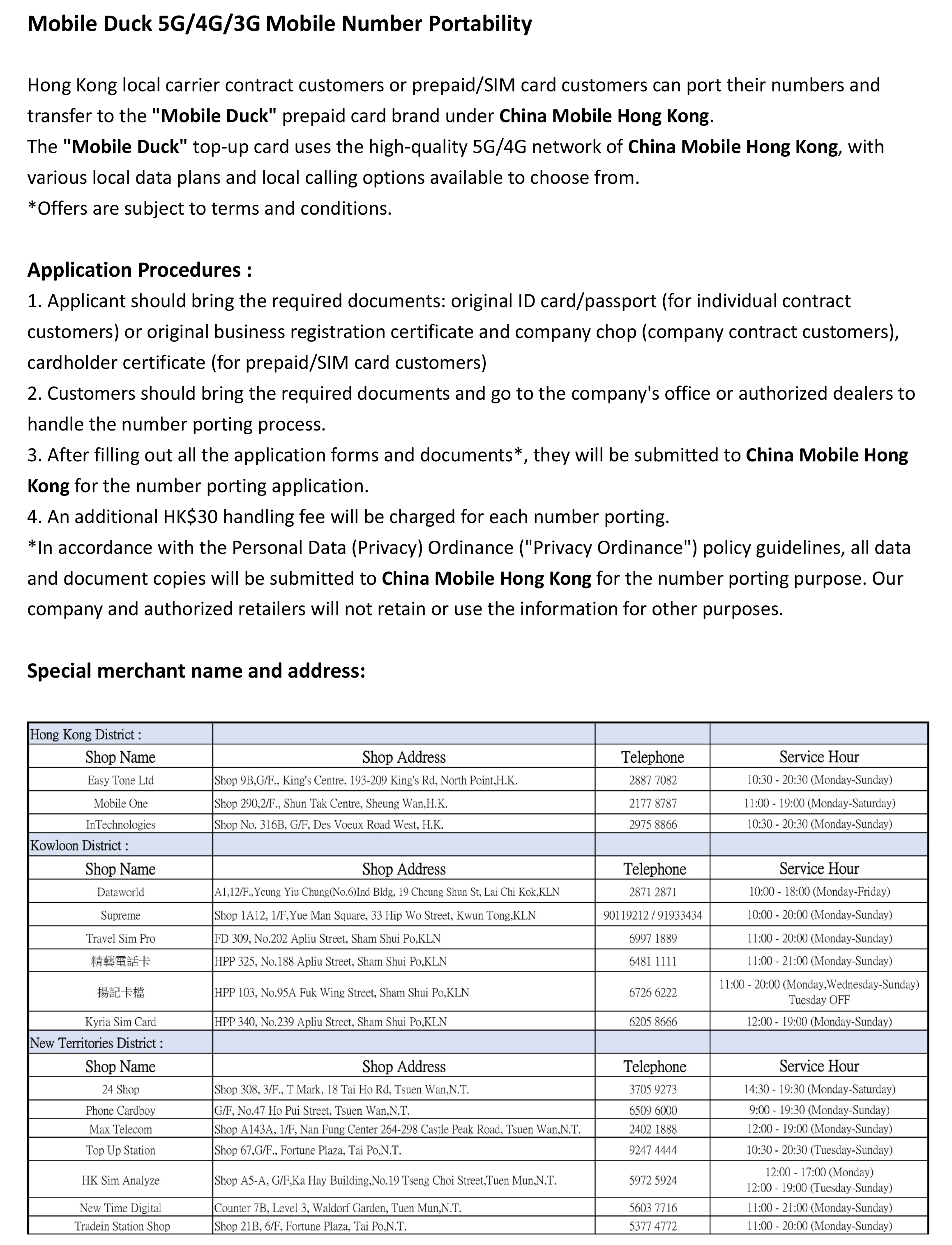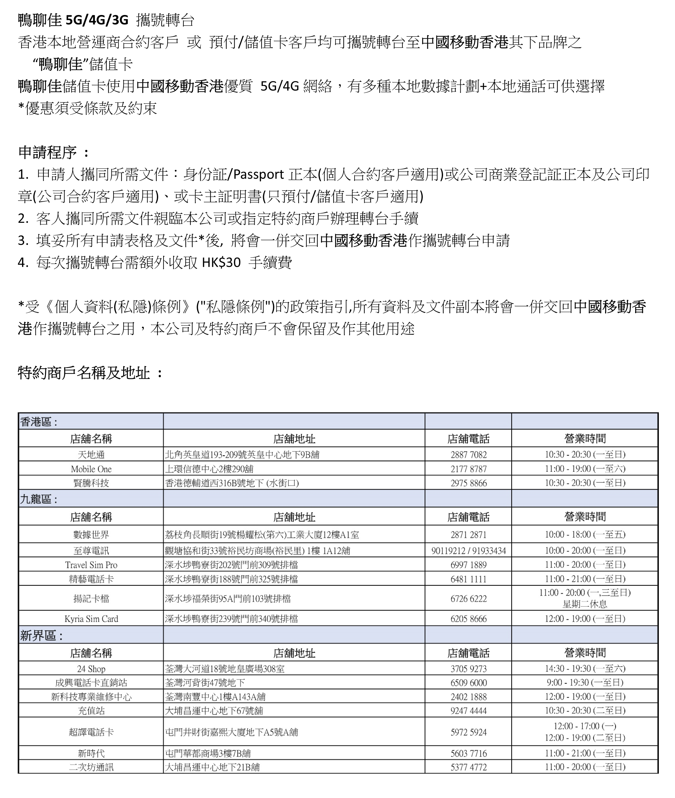 -鴨聊佳攜號轉台設有五個套餐 -【本地78GB﹑ 108GB﹑ 188GB, 中港18GB數據年卡365日】 -每月贈送300分鐘本地通話 (共送12次) * -支援數據共享到其他裝置 ------------------------------------------------------------- -【10GB本地數據半年180日】 -每月贈送300分鐘本地通話 (共送6次) * -支援數據共享到其他裝置 -(本地78GB﹑ 108GB﹑ 188GB套餐額外贈送流量, 優惠送完即止) -(中港18GB激活獎賞: 2025年10月6日或之前啟用可享3GB免費流量, 共21GB) 【現時使用中國移動網絡客戶,不能攜號轉台到鴨聊佳】 *此貨品不接受寄送服務,須親臨上門市或特約商戶辦理轉台取貨* -【Local data annual card 78GB﹑ 108GB﹑ 188GB , Mainland China & Hong Kong 18GB Valid for 365 days】 -Free 300 minutes of local airtime each month (total of 12 times)* -Supports data sharing to other devices ------------------------------------------------------------- -【Local Data 10GB Valid for 180 days】 -Free 300 minutes of local airtime each month (total of 6 times)* -Supports data sharing to other devices -(Additional data bonuses for local 78GB, 108GB, and 188GB plans are available while supplies last.) -(Activation reward for 18GB in Mainland China & Hong Kong: Activate by October 6, 2025, to receive 3GB of free data, totaling 21GB.) 【Current China Mobile network customers , cannot port their number to "Mobile Duck"】 *This product does not accept delivery service, you need to go to the physical store or authorized dealer to pick up the item*