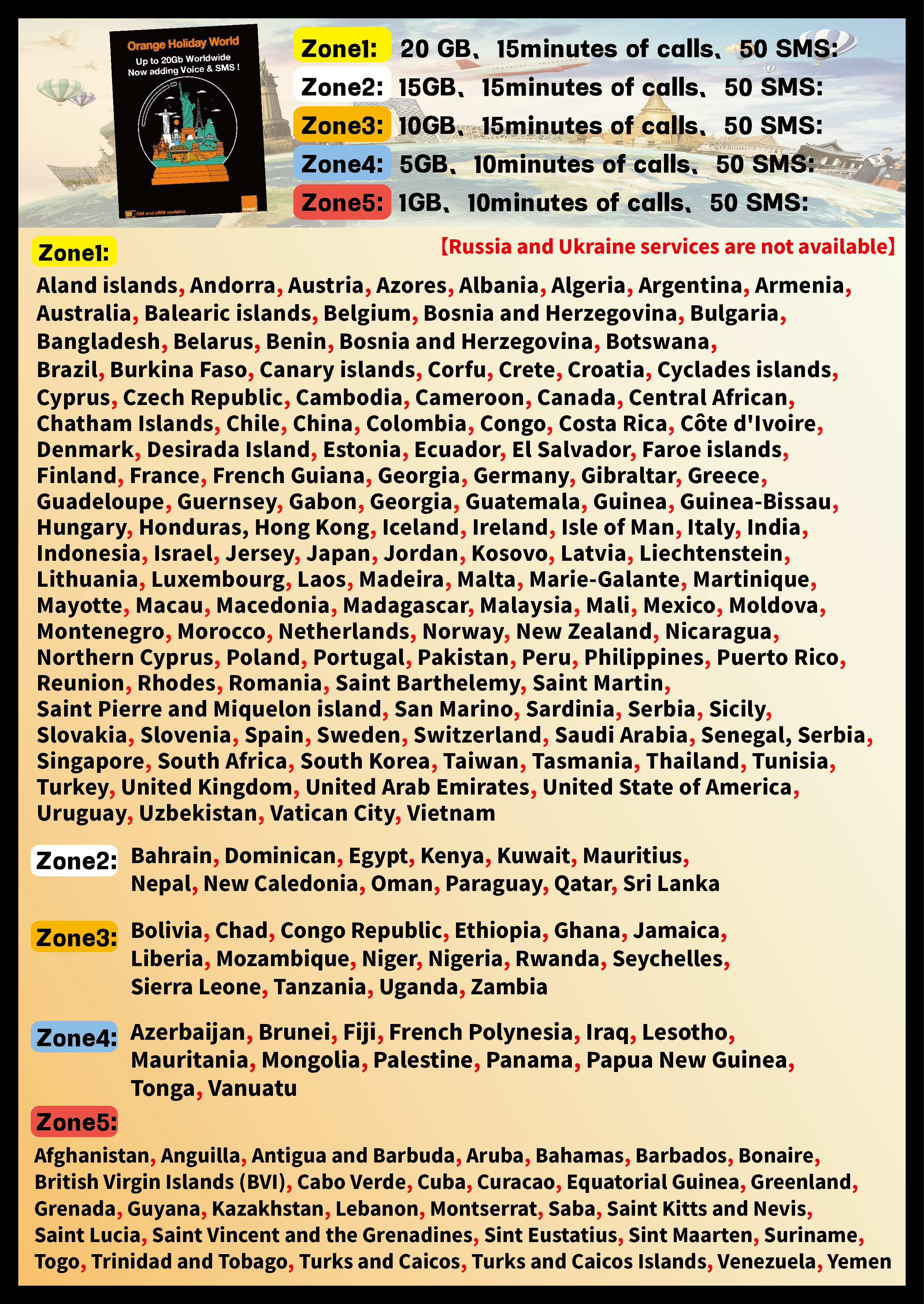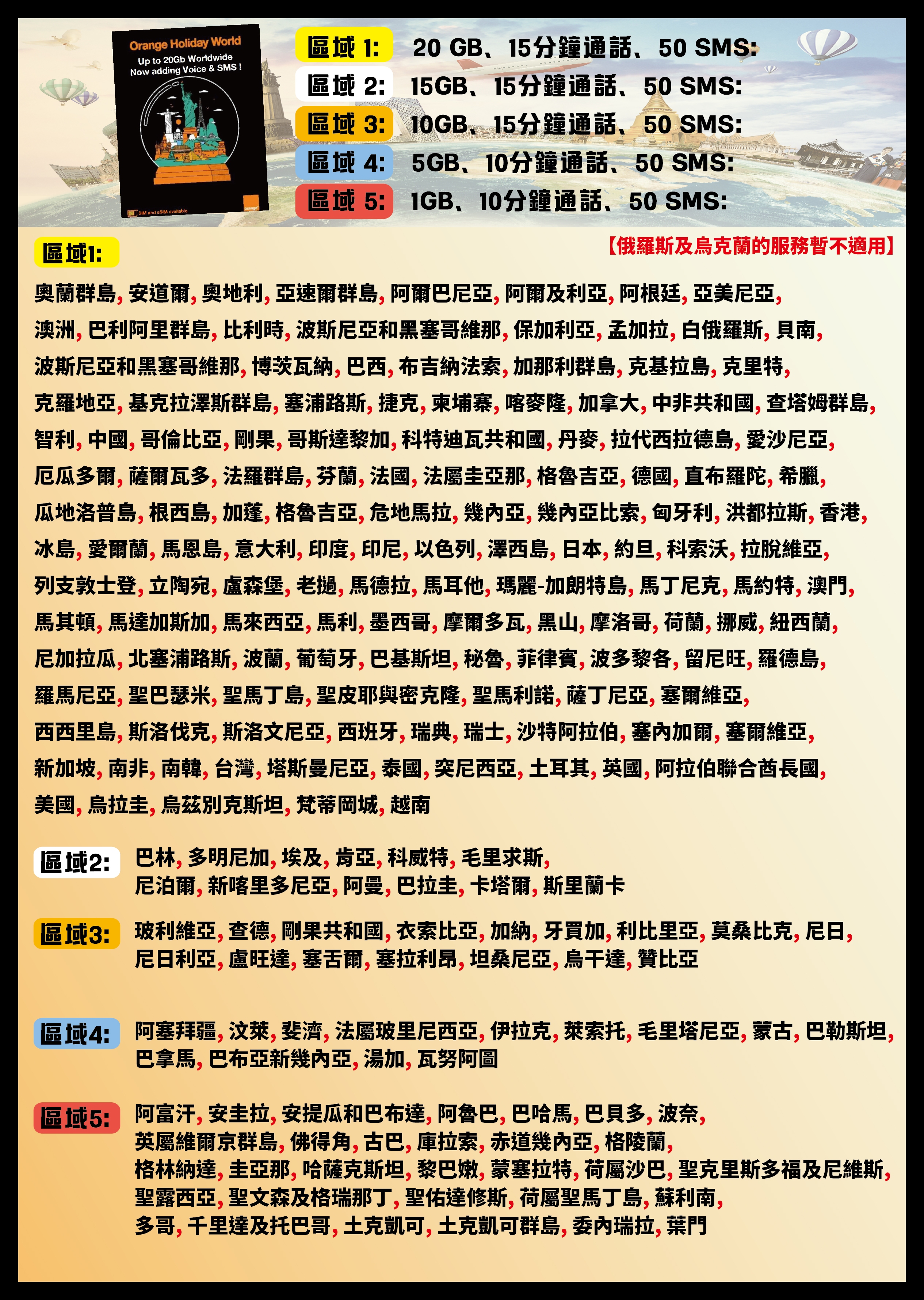 Orange Holiday World-30日20GB 全球200+國家地區5G/4G/3G數據卡