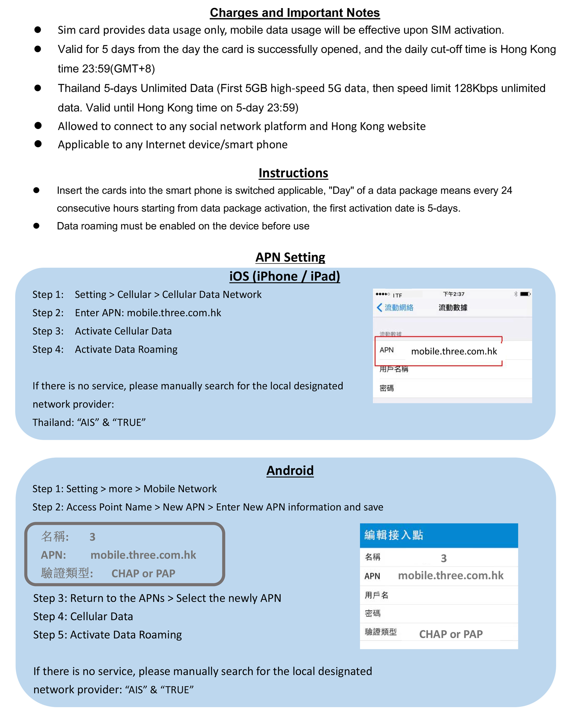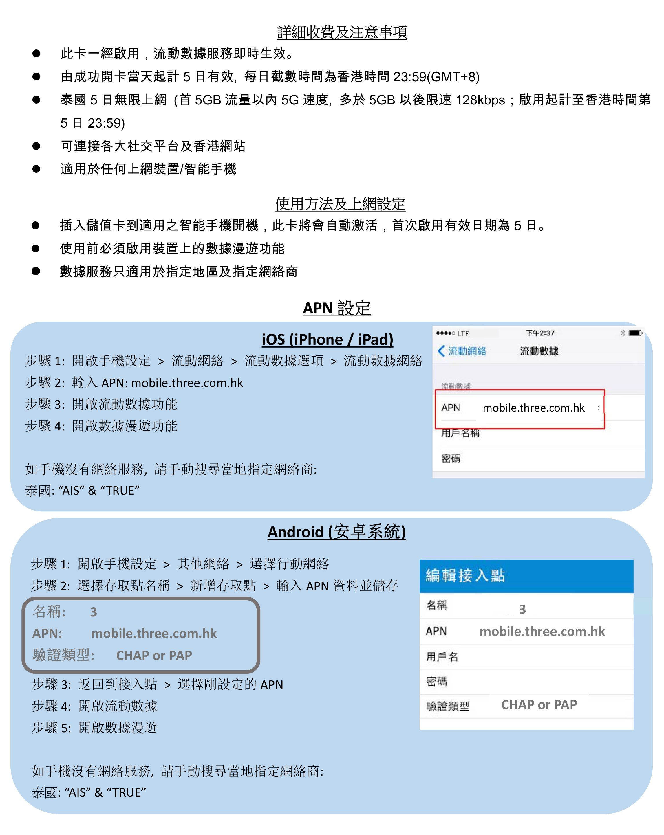 【新舊包裝隨機發貨】 -首5GB 5G高速流量, 其後將降速至128kbps無限數據 -由成功開卡當天起計5日有效, 每日截數時間為香港時間23:59 (GMT+8) -泰國網絡商: AIS / TRUE(*系統選網自動以TRUE優先*) -可連接各大社交平台及香港網站 -支援手機熱點數據分享, 限速後不能分享數據 -無須登記, 即買即用 -最後啟用日期為: 2026/7/31 【Random shipment of new and old packaging】 -First 5GB 5G high speed data, then speed limit 128kbps unlimited data -Valid for 5 days from the successful activation date, daily cut-off time is Hong Kong time 23:59 (GMT+8) -Thailand Service provided: AIS / TRUE (*system selects network automatically with TRUE as priority*) -Allowed to connect to any social network platform and Hong Kong website -Available to tethering share data, cannot be shared data after the speed limit. -Registration not required -Expiry date: 2026/7/31