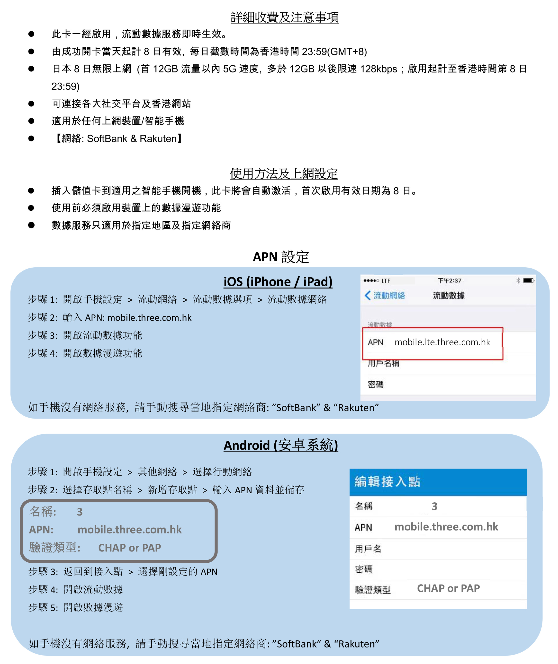 【新舊包裝隨機發貨】 -首12GB 5G 高速流量, 其後將降速至128kbps無限數據 -由成功開卡當天起計8日有效, 每日截數時間為香港時間23:59(GMT+8) -可連接各大社交平台及香港網站 -支援手機熱點數據分享, 限速後不能分享數據 -無須登記, 即買即用 -最後啟用日期為: 2026/8/31 - 【網絡: SoftBank & Rakuten】 【Random shipment of new and old packaging】 -First 12GB 5G high speed data, then speed limit 128Kbps unlimited data -Valid for 8 days from the successful activation date, daily cut-off time is Hong Kong time 23:59 (GMT+8) -Allowed to connect to any social network platform and Hong Kong website -Available to tethering share data, cannot be shared data after the speed limit. -Registration not required -Expiry date: 2026/8/31 -【Networks: SoftBank & Rakuten】
