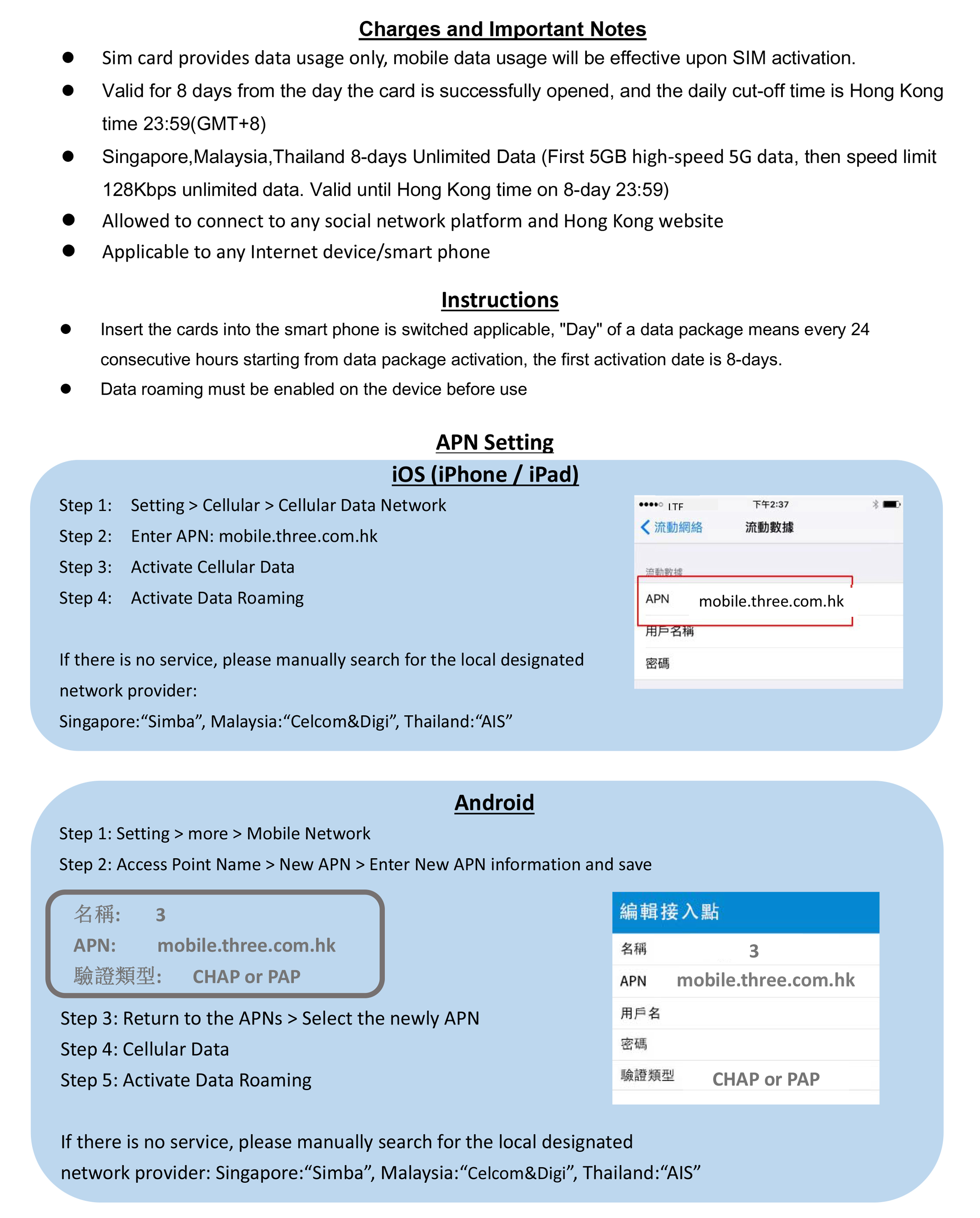 【新舊包裝隨機發貨】 -首5GB 5G 高速流量, 其後將降速至128kbps無限數據 -由成功開卡當天起計8日有效, 每日截數時間為香港時間23:59(GMT+8) -適用地區: 新加坡, 馬來西亞, 泰國 -(新加坡網絡: Simba & Starhub) , (馬來西亞網絡: Celcomdigi), (泰國網絡: AIS & TRUE *系統選網自動以TRUE優先*) -可連接各大社交平台及香港網站 -支援手機熱點數據分享, 限速後不能分享數據 -無須登記, 即買即用 -最後啟用日期為: 2026/9/30 【Random shipment of new and old packaging】 -First 5GB 5G high speed data, then speed limit 128kbps unlimited data -Valid for 8 days from the successful activation date, daily cut‐off time is Hong Kong time 23:59 (GMT+8) -Applicable regions: Singapore, Malaysia, Thailand -(Singapore networks: Simba & Starhub), (Malaysia networks: Celcomdigi), (Thailand networks: AIS & TRUE *system selects network automatically with TRUE as priority*) -Allowed to connect to any social network platform and Hong Kong website -Available to tethering share data, cannot be shared data after the speed limit. -Registration not required -Expiry date: 2026/9/30