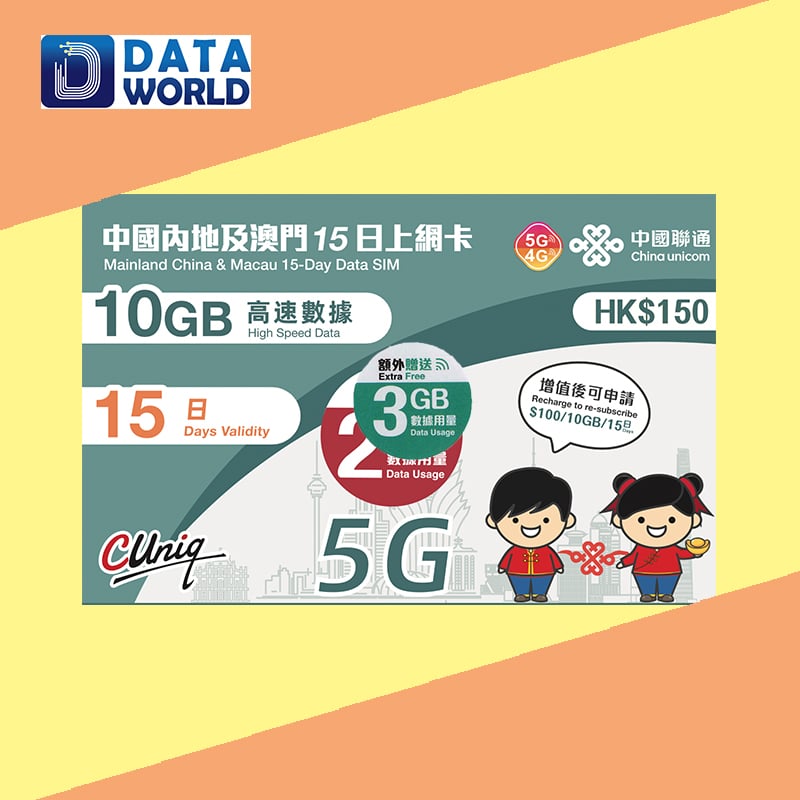 中國聯通 5G/4G $150 內地及澳門15日10+2GB上網卡