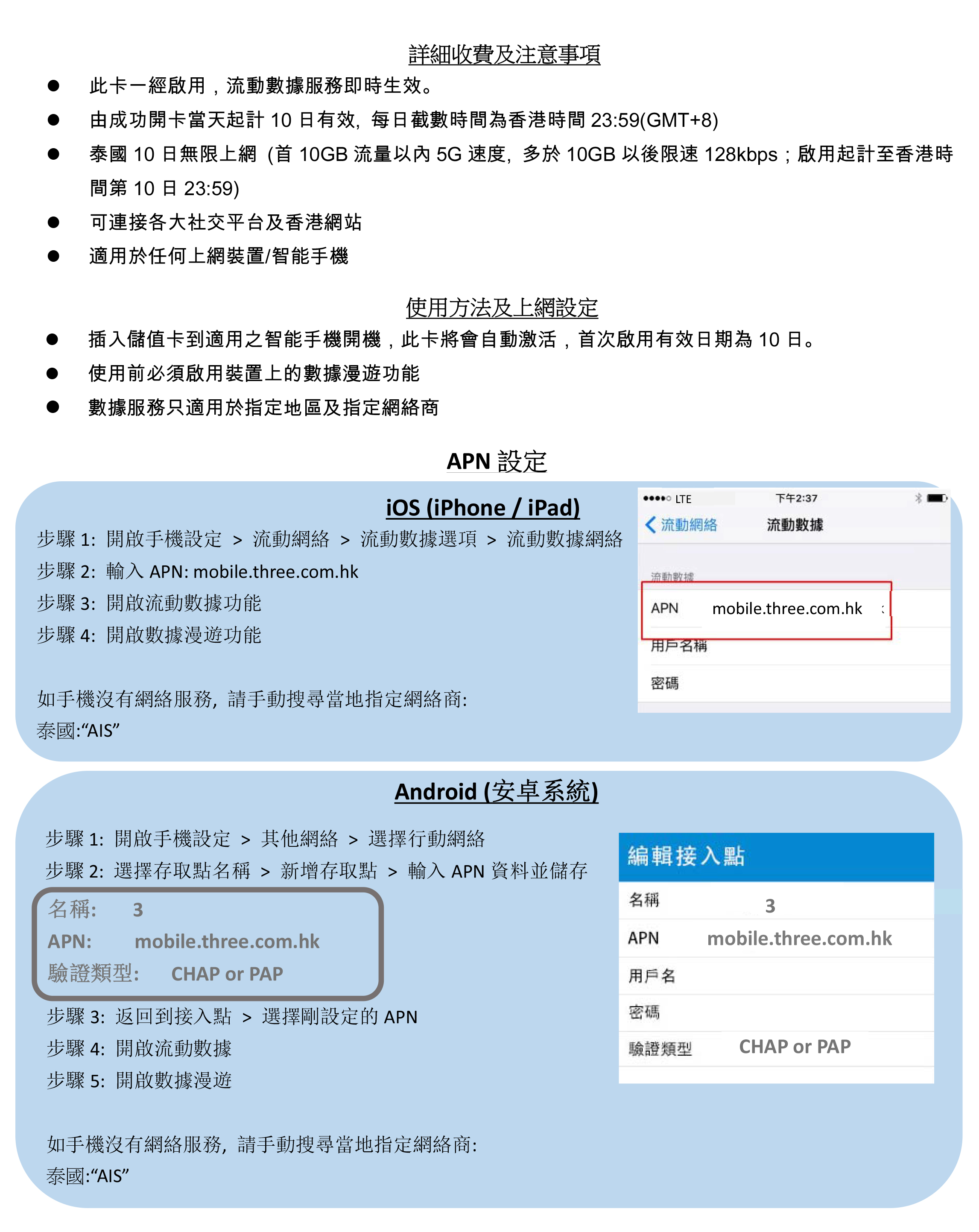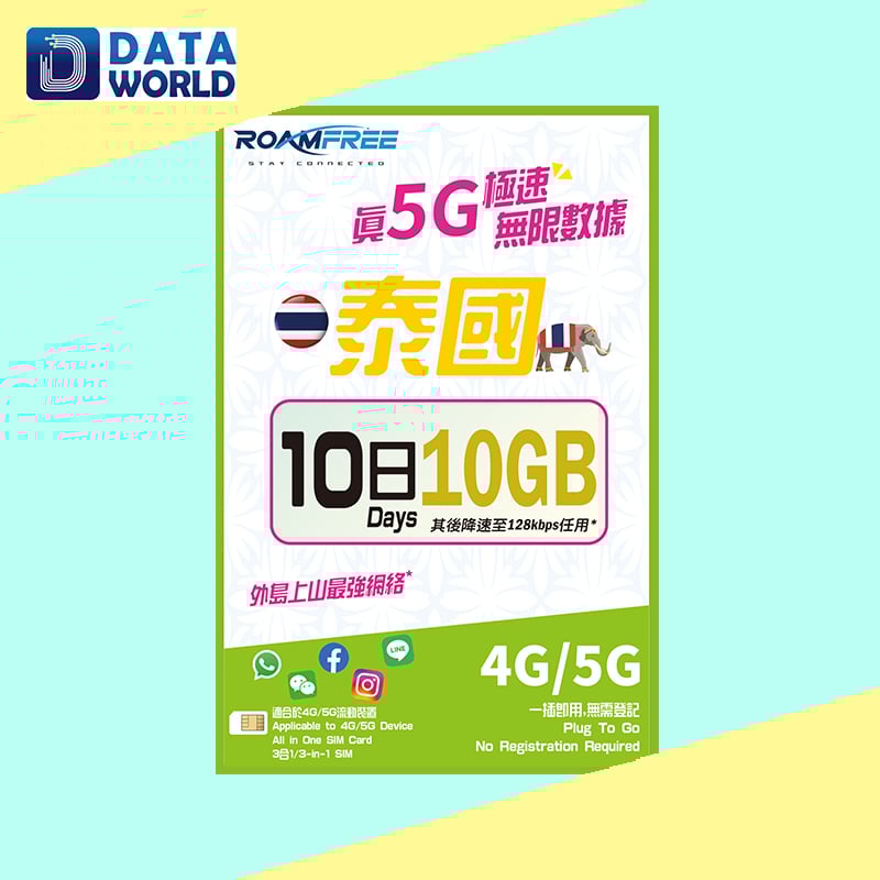 -首10GB 5G高速流量, 其後將降速至128kbps無限數據 -由成功開卡當天起計10日有效, 每日截數時間為香港時間23:59 (GMT+8) -泰國網絡商: AIS -可連接各大社交平台及香港網站 -支援手機熱點數據分享, 限速後不能分享數據 -無須登記, 即買即用 -最後啟用日期為: 2026/7/31 -First 10GB 5G high speed data, then speed limit 128kbps unlimited data -Valid for 10 days from the successful activation date, daily cut-off time is Hong Kong time 23:59 (GMT+8) -Thailand Service provided: AIS -Allowed to connect to any social network platform and Hong Kong website -Available to tethering share data, cannot be shared data after the speed limit. -Registration not required -Expiry date: 2026/7/31
