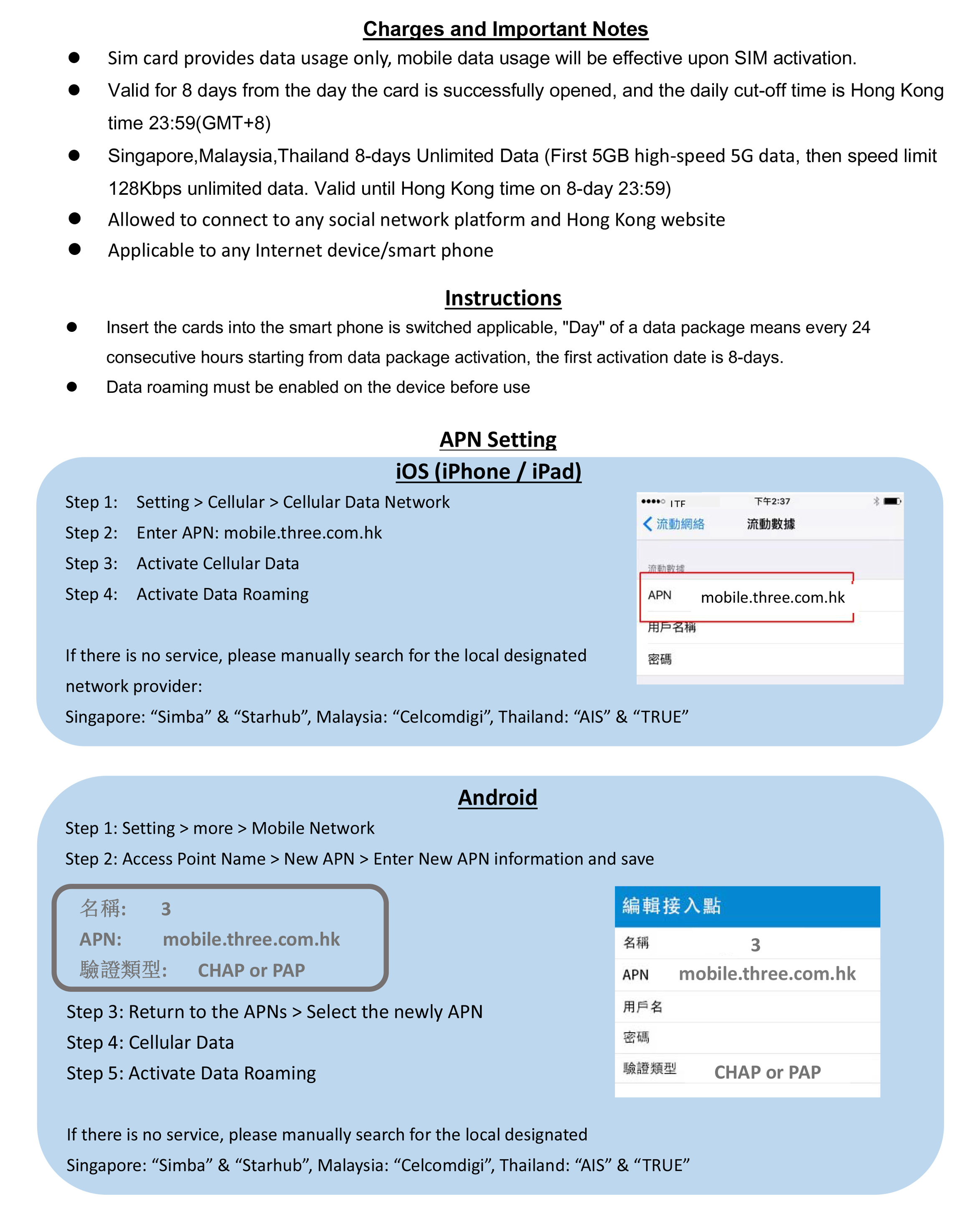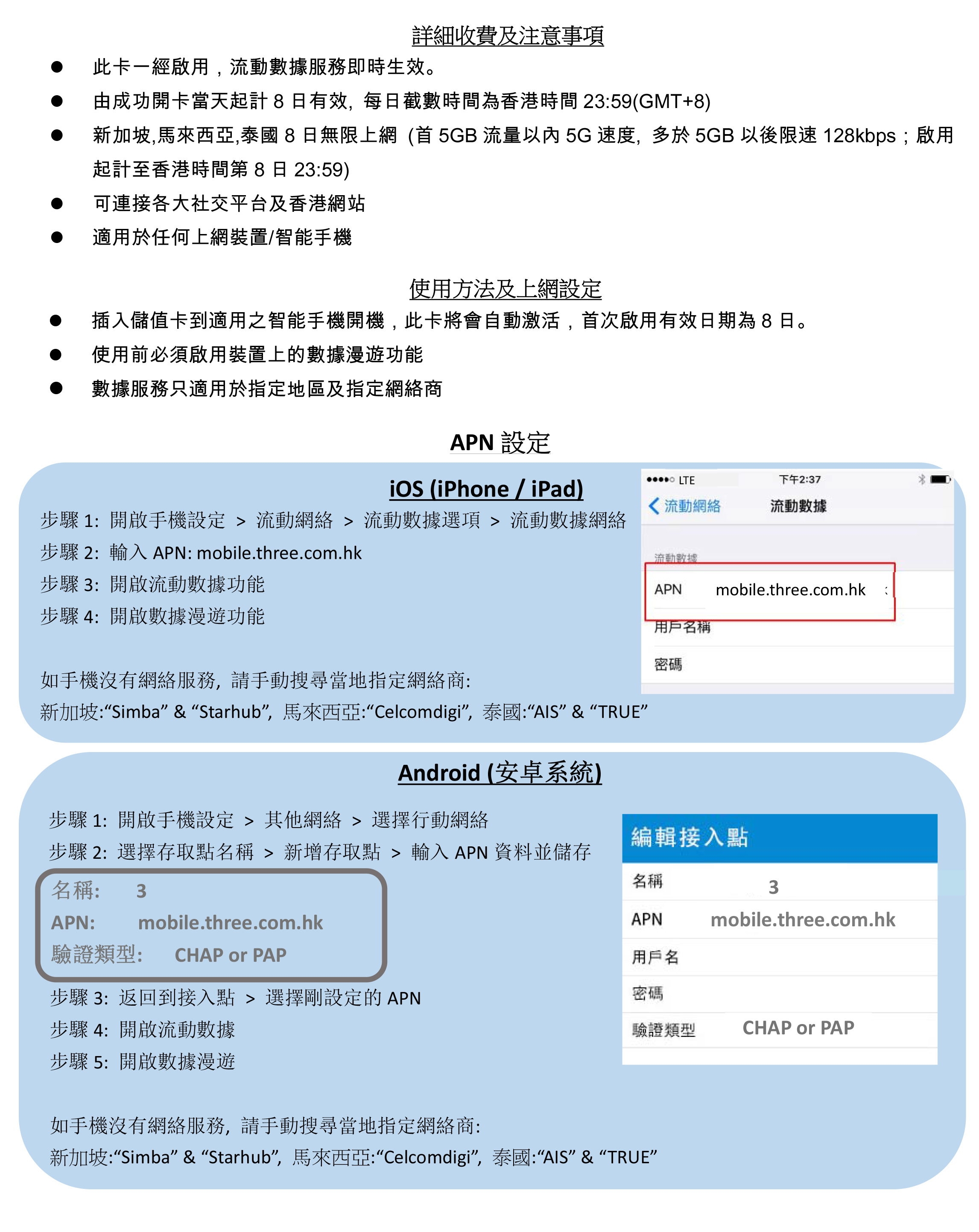 【新舊包裝隨機發貨】 -首5GB 5G 高速流量, 其後將降速至128kbps無限數據 -由成功開卡當天起計8日有效, 每日截數時間為香港時間23:59(GMT+8) -適用地區: 新加坡, 馬來西亞, 泰國 -(新加坡網絡: Simba & Starhub) , (馬來西亞網絡: Celcomdigi), (泰國網絡: AIS & TRUE *系統選網自動以TRUE優先*) -可連接各大社交平台及香港網站 -支援手機熱點數據分享, 限速後不能分享數據 -無須登記, 即買即用 -最後啟用日期為: 2026/9/30 【Random shipment of new and old packaging】 -First 5GB 5G high speed data, then speed limit 128kbps unlimited data -Valid for 8 days from the successful activation date, daily cut‐off time is Hong Kong time 23:59 (GMT+8) -Applicable regions: Singapore, Malaysia, Thailand -(Singapore networks: Simba & Starhub), (Malaysia networks: Celcomdigi), (Thailand networks: AIS & TRUE *system selects network automatically with TRUE as priority*) -Allowed to connect to any social network platform and Hong Kong website -Available to tethering share data, cannot be shared data after the speed limit. -Registration not required -Expiry date: 2026/9/30
