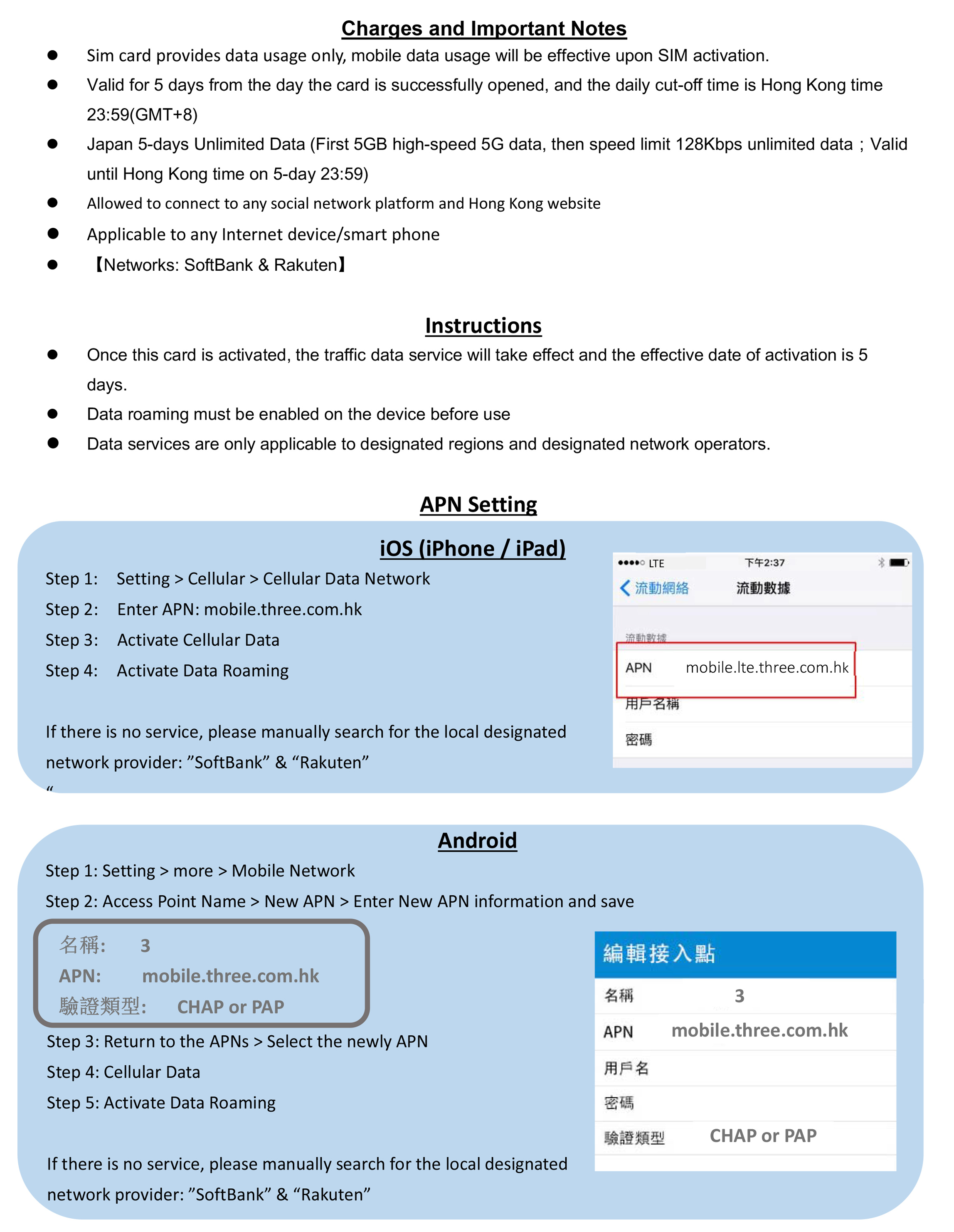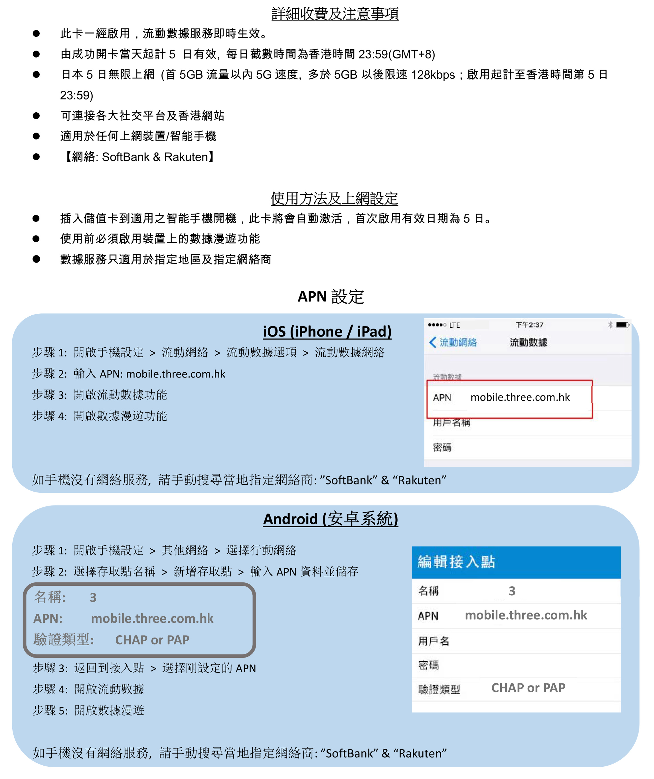 【新舊包裝隨機發貨】 - 首5GB 5G 高速流量, 其後將降速至128kbps無限數據 - 由成功開卡當天起計5 日有效, 每日截數時間為香港時間23:59(GMT+8) - 可連接各大社交平台及香港網站 - 支援手機熱點數據分享, 限速後不能分享數據 -必須打開Volte 功能 - 無須登記, 即買即用 - 最後啟用日期為: 2026/9/30 - 【網絡: SoftBank & Rakuten】 【Random shipment of new and old packaging】 -First 5GB 5G high speed data, then speed limit 128Kbps unlimited data -Valid for 5 days from the successful activation date, daily cut-off time is Hong Kong time 23:59 (GMT+8) -Allowed to connect to any social network platform and Hong Kong website -Available to tethering share data, cannot be shared data after the speed limit. -Turn on "VoLTE" function -Registration not required -Expiry date: 2026/9/30 -【Networks: SoftBank & Rakuten】