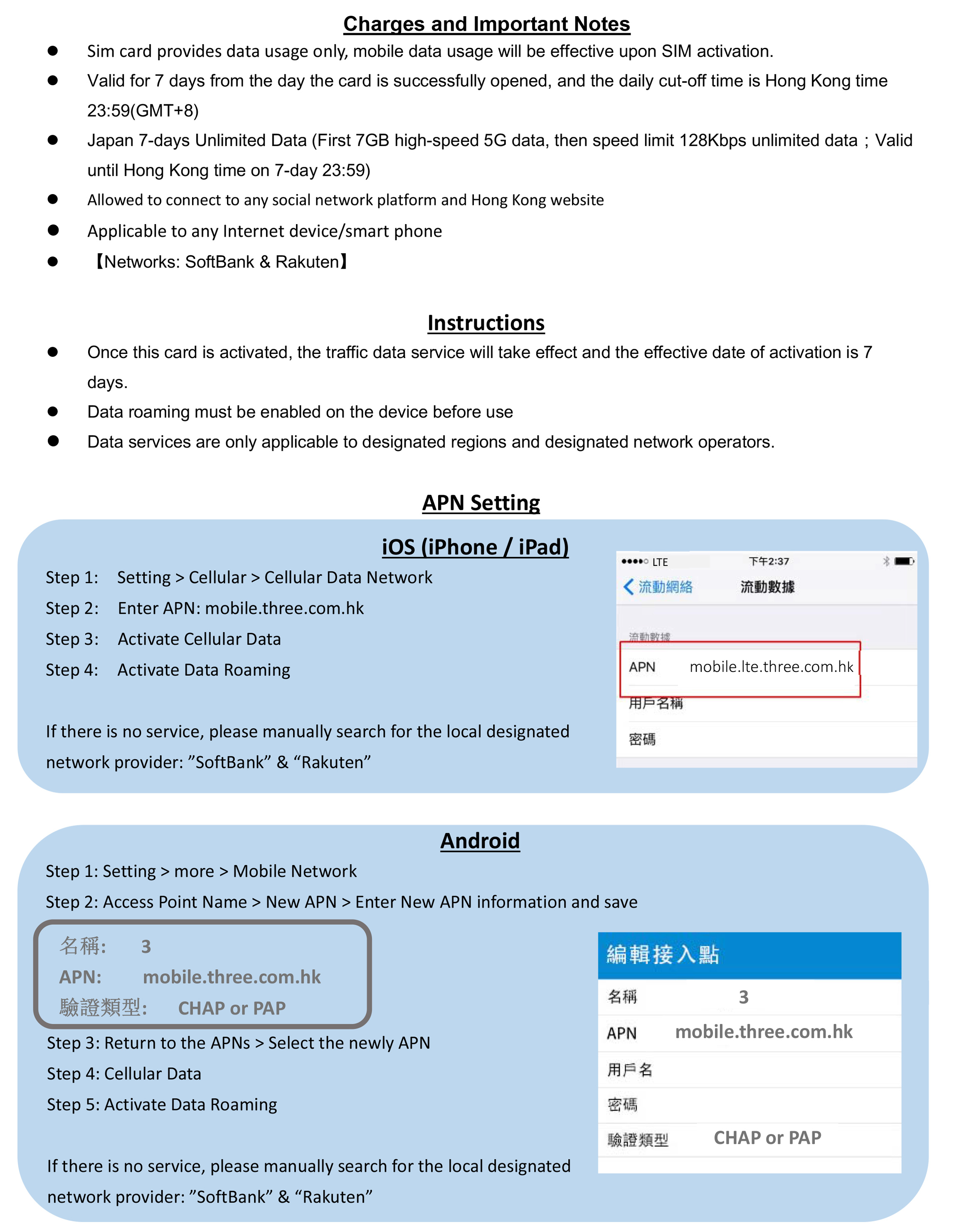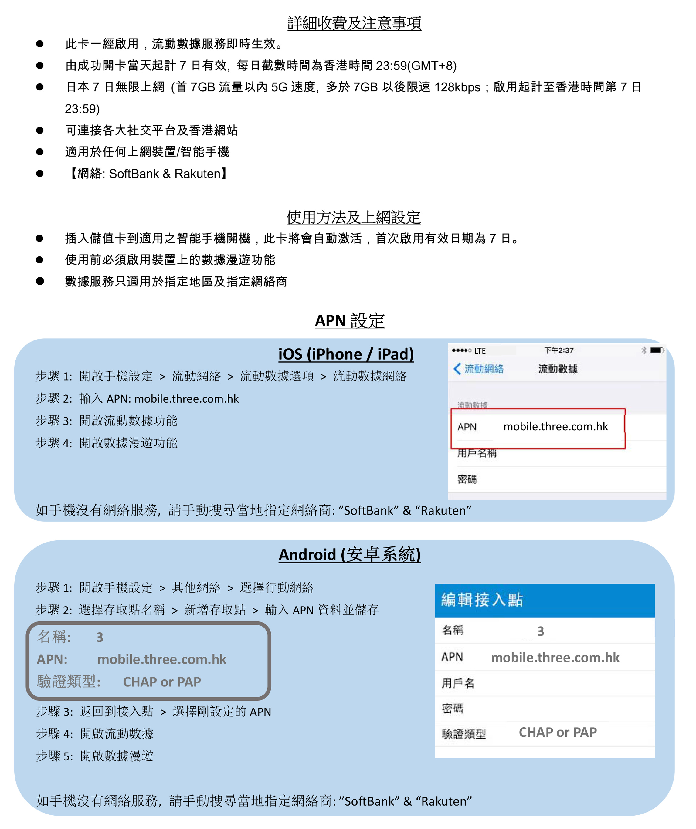 【新舊包裝隨機發貨】 - 首7GB 5G 高速流量, 其後將降速至128kbps無限數據 - 由成功開卡當天起計7日有效, 每日截數時間為香港時間23:59 (GMT+8) - 可連接各大社交平台及香港網站 - 支援手機熱點數據分享, 限速後不能分享數據 -必須打開Volte 功能 - 無須登記, 即買即用 - 最後啟用日期為: 2026/9/30 - 【網絡: SoftBank & Rakuten】 【Random shipment of new and old packaging】 -First 7GB 5G high speed data, then speed limit 128Kbps unlimited data -Valid for 7 days from the successful activation date, daily cut-off time is Hong Kong time 23:59 (GMT+8) -Allowed to connect to any social network platform and Hong Kong website -Available to tethering share data, cannot be shared data after the speed limit. -Turn on "VoLTE" function -Registration not required -Expiry date: 2026/9/30 -【Networks: SoftBank & Rakuten】